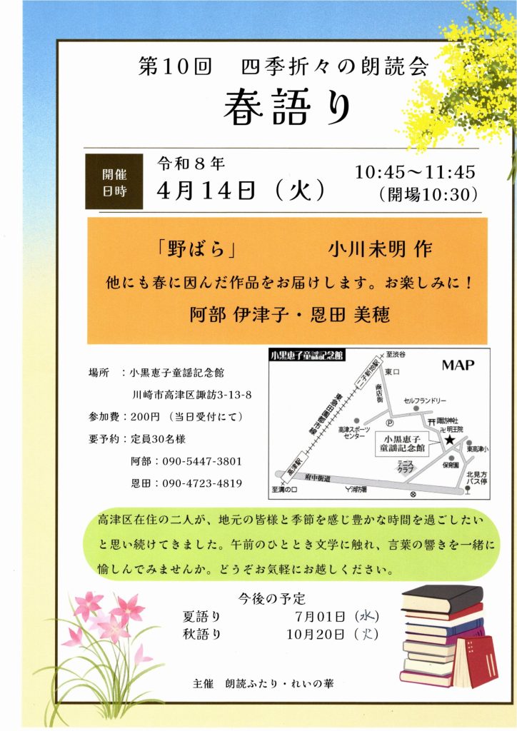 2026年2月2日 / 最終更新日時 : 2026年2月2日 oguro_admin 貸しホール 【貸しホール情報】四季折々の朗読会 『春語り』 四季折々の朗読会 『春語り』 4月14日(火)10:45~11:45 こんにちは 高津区在住のふたりが、地元の皆様と一緒に豊かな時間を過ごしたいと思い、 多摩川の自然に囲まれたこの小黒恵子童謡記念館で朗読会をいたします。 季節を感じながら、文学に触れ、美しい日本語の表現や響きを愉しんでいただけたら嬉しいです。 どうぞお気軽にお越しください。